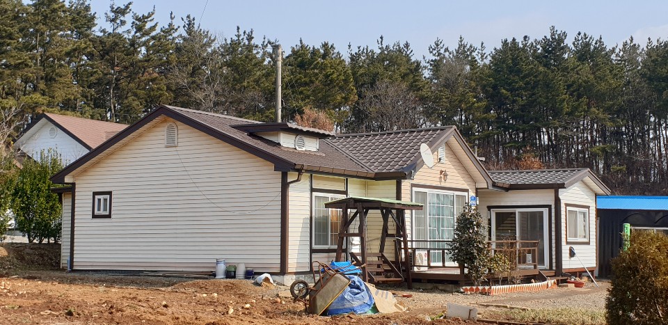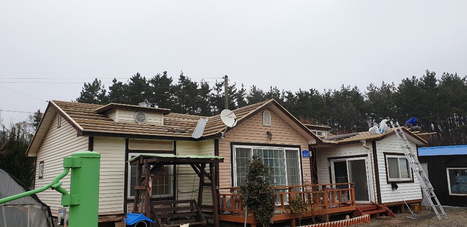 충남 태안군 도내리. 아스팔트싱글지붕을 칼라강판 평기와골로 시공.