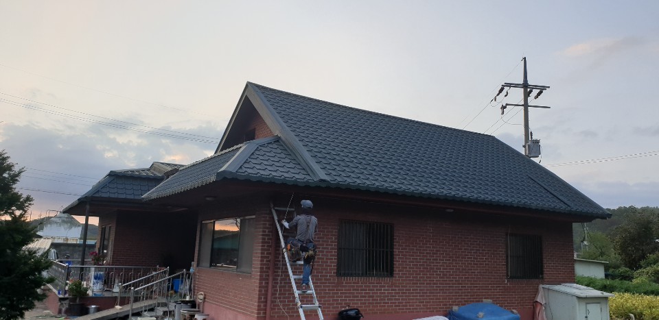 파주시 광탄면 마장리. 아스팔트 싱글로 된 데스리와 지붕을 칼라강판 평기와골로 개랑하고 이어진 슬라브지붕도 칼라강판으로 시공.