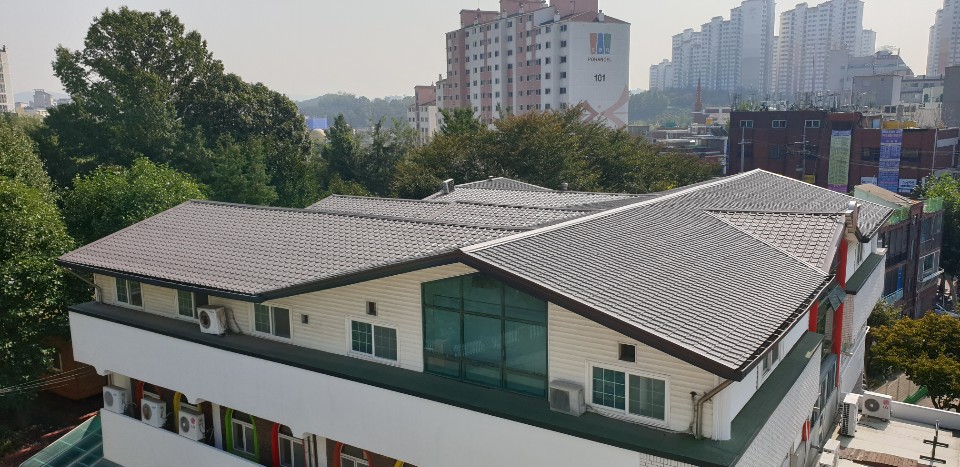 부천시 괴안동에 워치한 유치원으로 아스팔트 싱글위 정재로 하지작업후 칼라강판 평기와골로 시공.