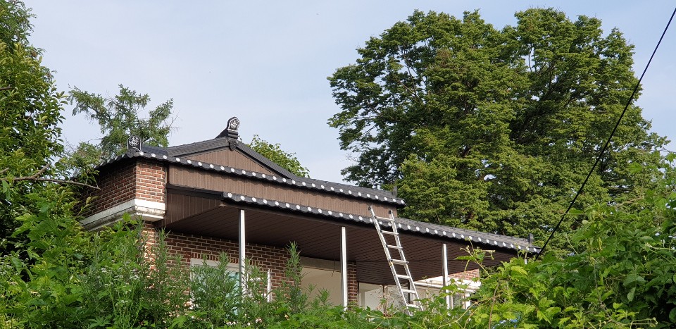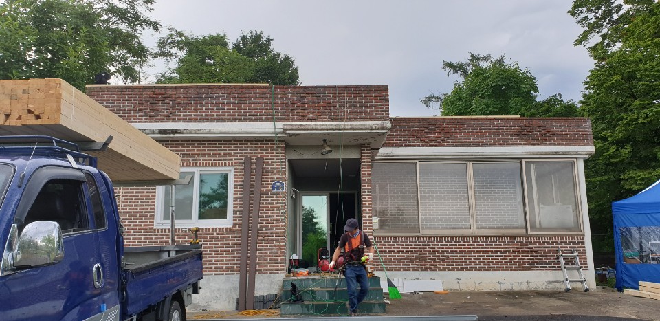 괴산군 청안면 문방리. 목재로 하지작업후 슬라브지붕을 개량하고 각파이프로 기둥을 세워 현관처마를 늘려 시공한 사례