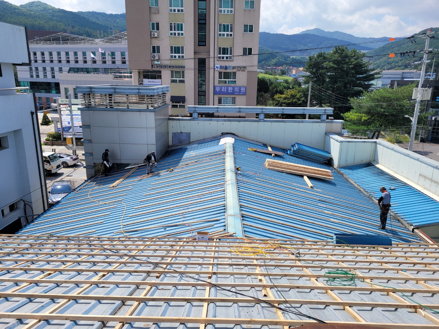 남양주시 수동면 농협하나로마트. 노후된 V250 판넬지붕을 정재,각재로 하지작업후 아연도칼라강판 슬레이트골로 덧시공함