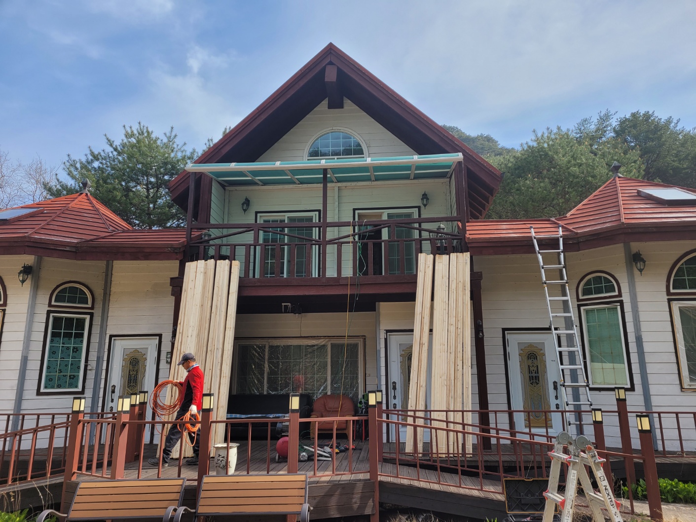 강원도 인제군 소치마을에 위치한 펜션으로, 금속기와지붕의 누수로 인해 칼라강판으로 개량공사함.