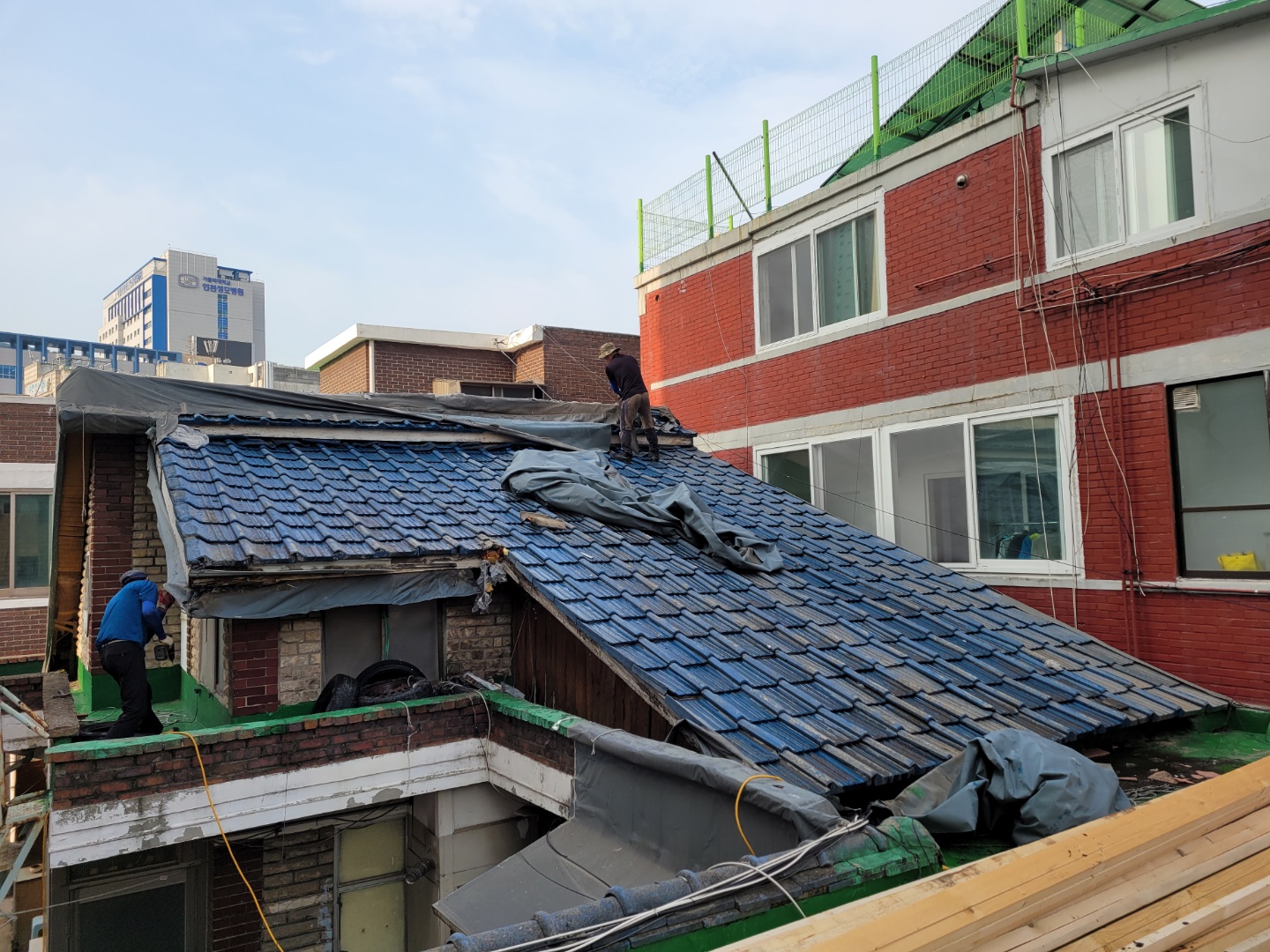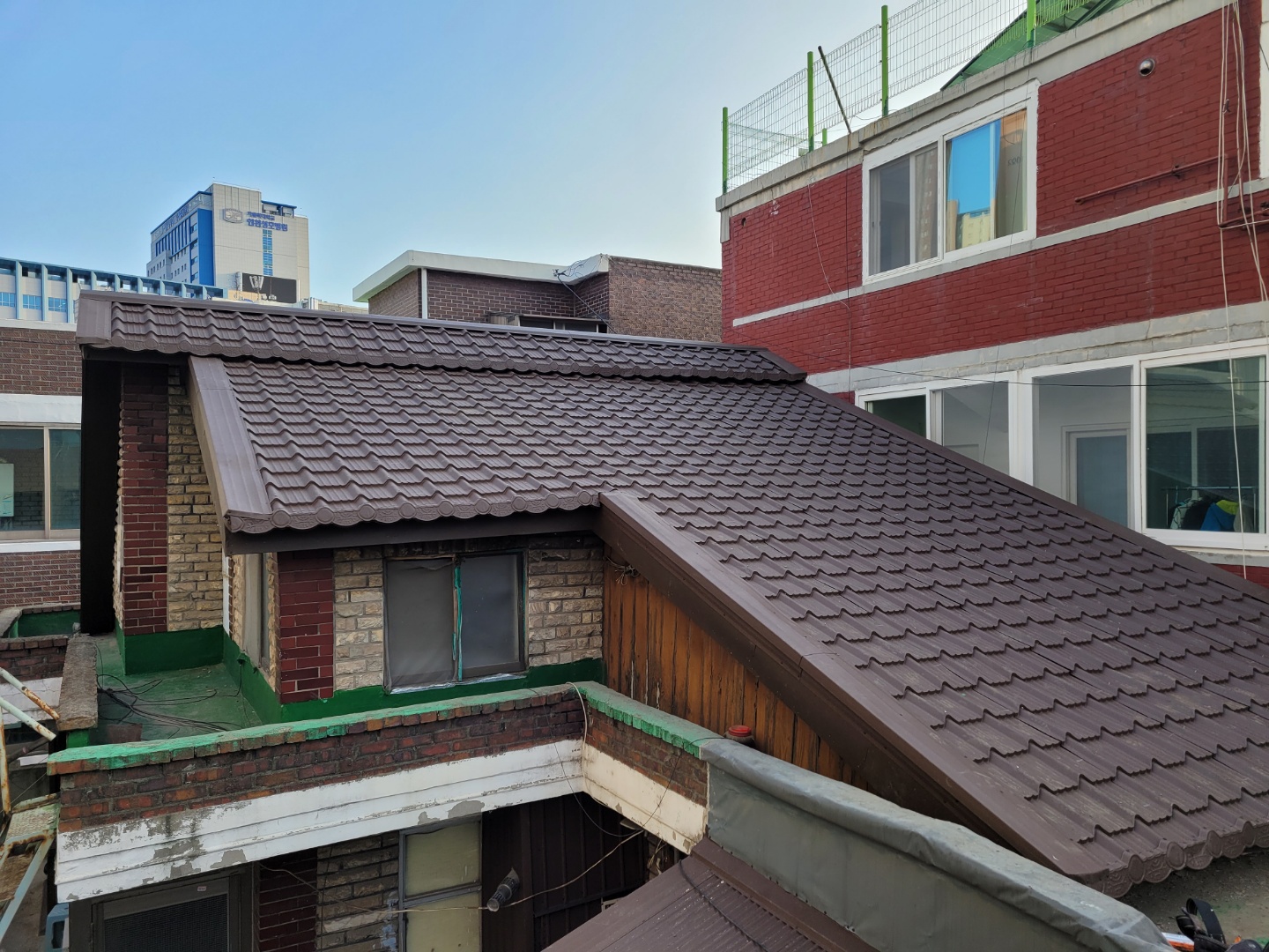 인천시 부평구 부평동. 기와를 철거하지않고 정재,각재로 하지작업후 칼라강판 평기와골로 개량함.