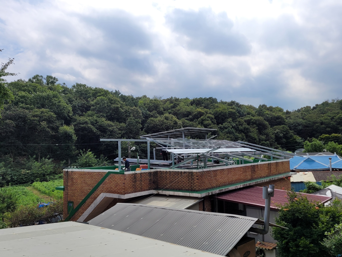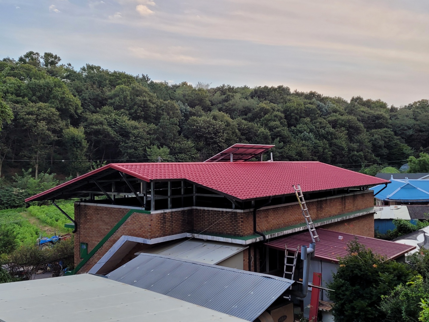 화성시 비봉면 수하리에 위치한 농가주택으로 슬라브지붕위에 각파이프로 하지작업후 아연도칼라강판으로 개랑공사함.