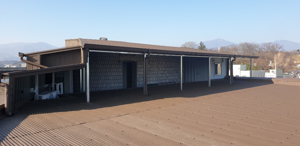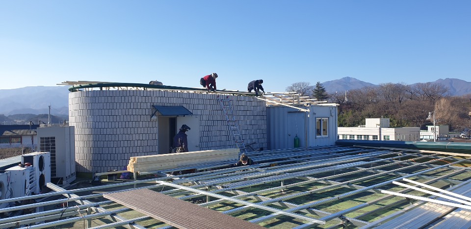 강원도 양양군 양양읍에 위치한 산림조합건물로 슬라브지붕에 각파이프로 하지작업후 옥상활용이 가능하도록 바닥시트형으로 시공함.