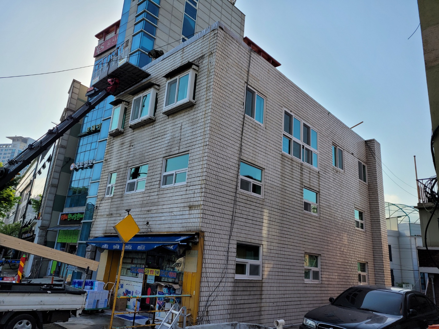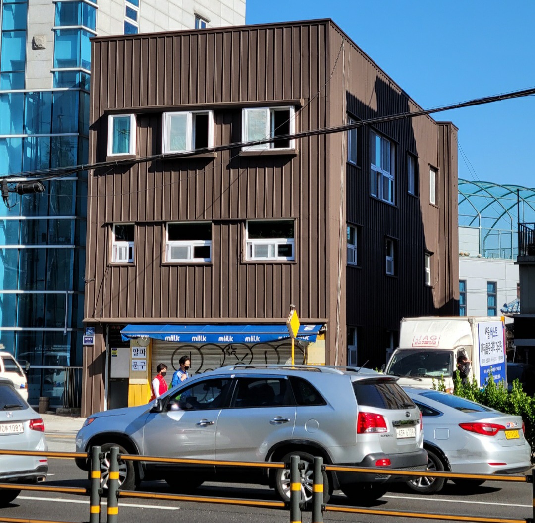 서울시 사당동. 창문교체작업후 슬라브지붕과 외벽을 칼라강판 징크V250소재 차콜색상으로 시공함.