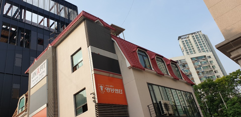 서울시 서초구 반포동. 아스팔트싱글 지붕을 칼라강판 평기와골로 개량공사함.
